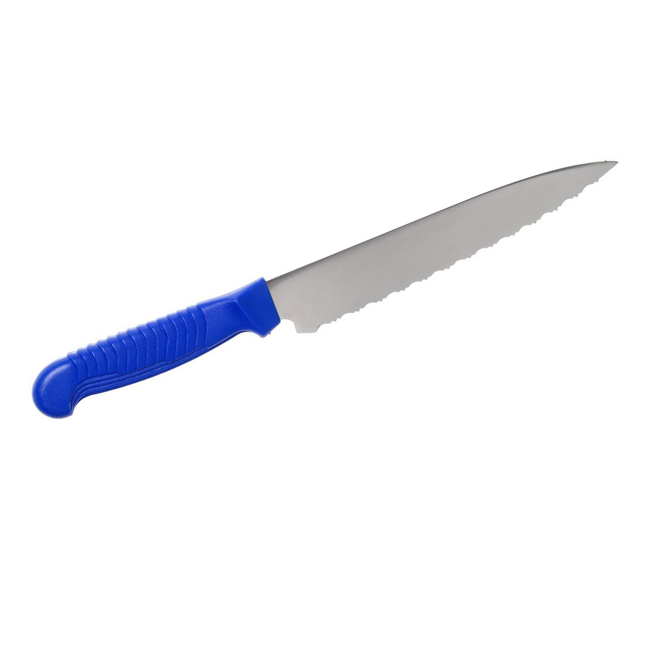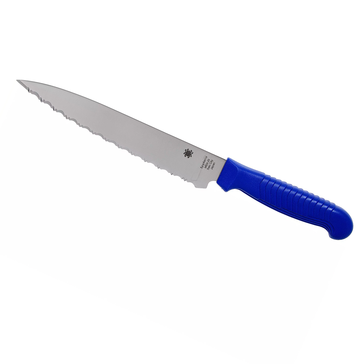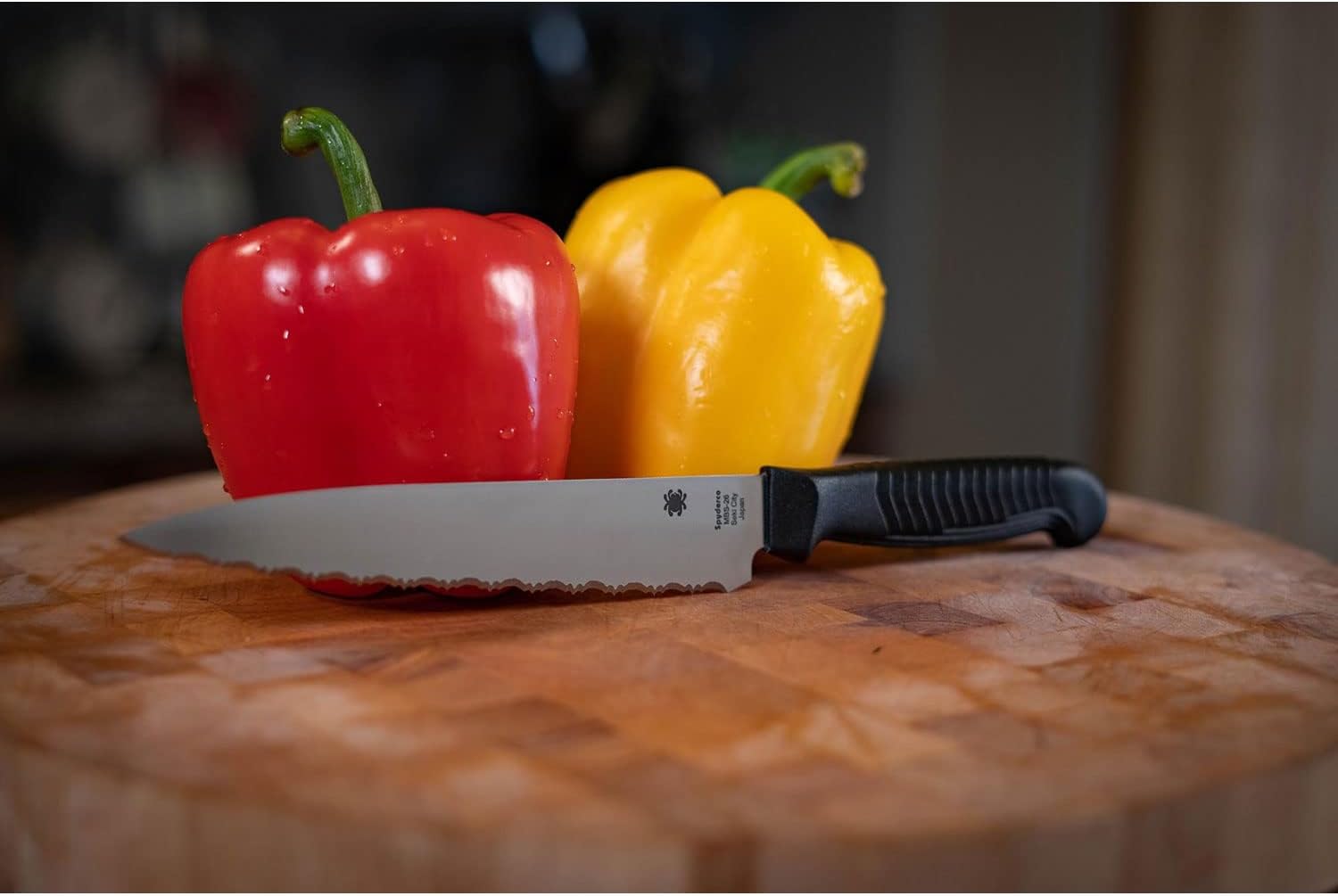 Spyderco's betrokkenheid bij keukenmessen gaat terug tot het begin van de jaren tachtig en het begin van de messenproductie van het bedrijf. Na een aantal jaren uit productie te zijn geweest, zijn ze nu op veler verzoek terug en beter dan ooit. Onze huidige keukenmessen combineren alle onderscheidende kenmerken van de originelen met een verbeterd handvatmateriaal dat een grotere duurzaamheid biedt. Het K04-tomatenmes heeft een 16,5 cm lang drop-point lemmet dat een uitstekende balans biedt tussen controle en snijprestaties. Dit maakt het mes ongelooflijk veelzijdig en geschikt voor tal van snijklussen in de keuken en andere praktische toepassingen. Net als de originele versie heeft het een hoogwaardig MBS-26 roestvrijstalen lemmet, dat uitzonderlijk dun is geslepen en zorgvuldig warmtebehandeld voor een optimale snijkwaliteit. Het duurzame polypropyleen plastic handvat is rechtstreeks op de tang van het lemmet gespoten en heeft een opvallend 'getrapt' textuurpatroon dat zorgt voor verbazingwekkend comfort en controle tijdens het gebruik. De K04 is verkrijgbaar met een zwart of blauw handvat en SpyderEdge-lemmet met een uniek tweestaps kartelpatroon dat de snede beschermt tegen bot worden op snijplanken.