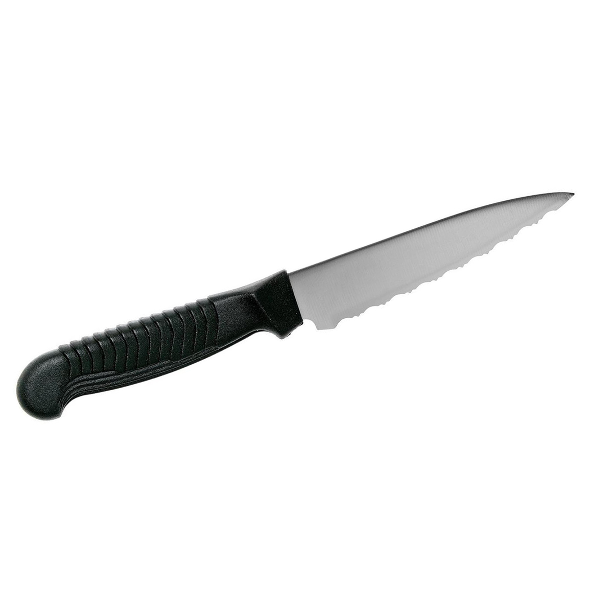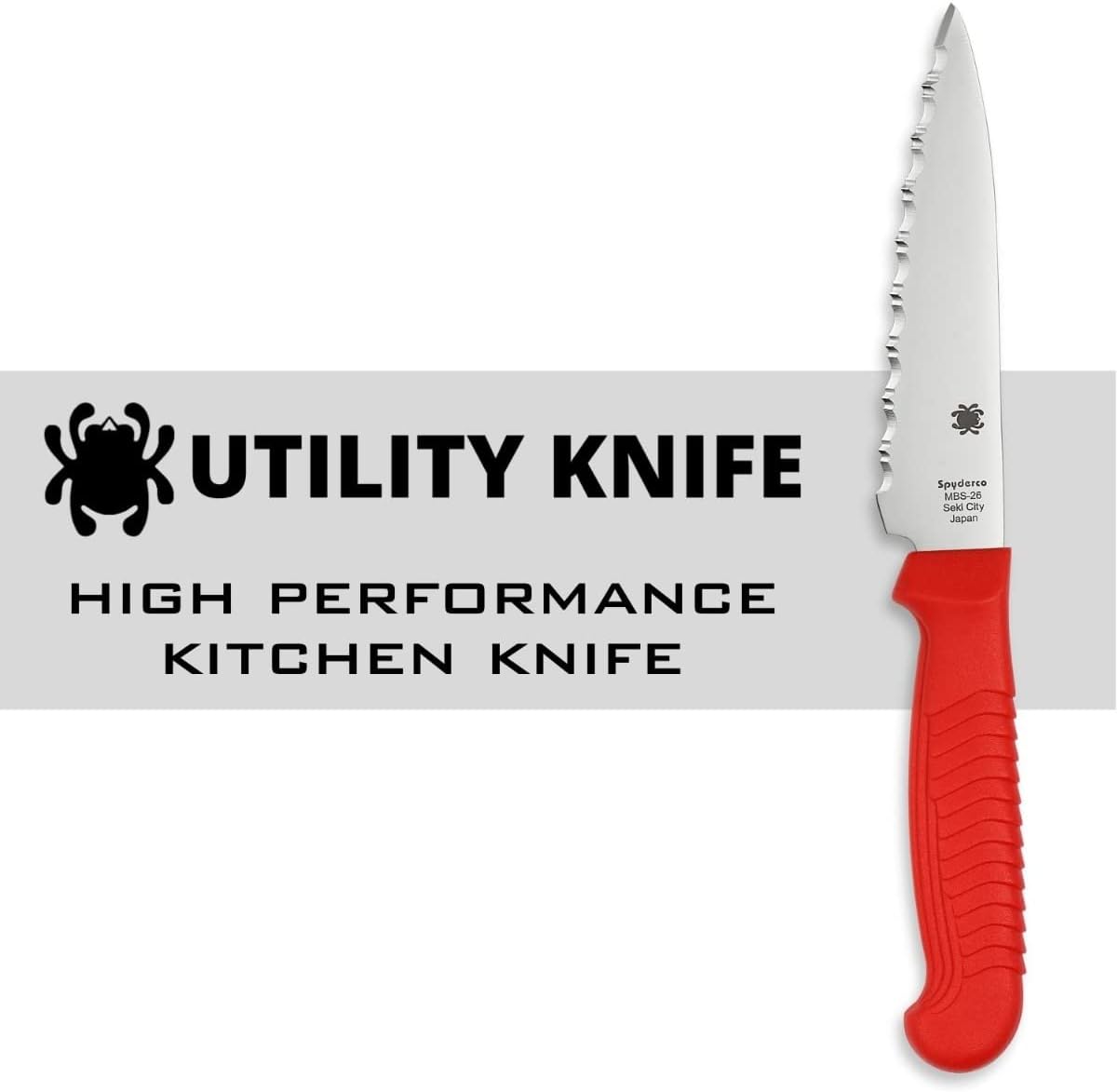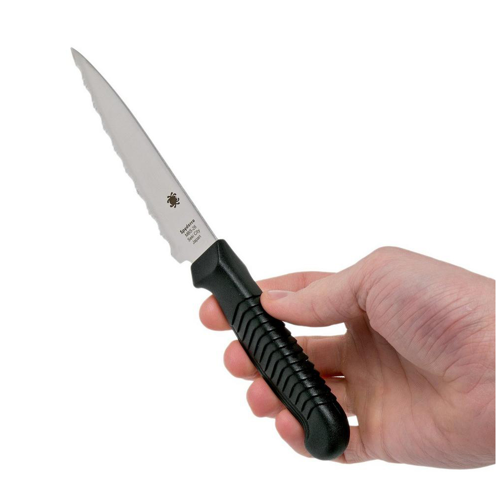 Spyderco's betrokkenheid bij keukenmessen gaat terug tot het begin van de jaren tachtig en het begin van de messenproductie van het bedrijf. Na een aantal jaren uit productie te zijn geweest, zijn ze nu op veler verzoek terug en beter dan ooit. Onze huidige keukenmessen combineren alle onderscheidende kenmerken van de originelen met een verbeterd handvatmateriaal dat een grotere duurzaamheid biedt. Het K05-tomatenmes heeft een 11,50 cm lang drop-point lemmet dat een uitstekende balans biedt tussen controle en snijprestaties. Dit maakt het mes ongelooflijk veelzijdig en geschikt voor tal van snijklussen in de keuken en andere praktische toepassingen. Net als de originele versie heeft het een hoogwaardig MBS-26 roestvrijstalen lemmet, dat uitzonderlijk dun is geslepen en zorgvuldig warmtebehandeld voor een optimale snijkwaliteit. Het duurzame polypropyleen plastic handvat is rechtstreeks op de tang van het lemmet gespoten en heeft een opvallend 'getrapt' textuurpatroon dat zorgt voor verbazingwekkend comfort en controle tijdens het gebruik. De K05 is verkrijgbaar met een zwart of blauw handvat en SpyderEdge-lemmet met een uniek tweestaps kartelpatroon dat de snede beschermt tegen bot worden op snijplanken.