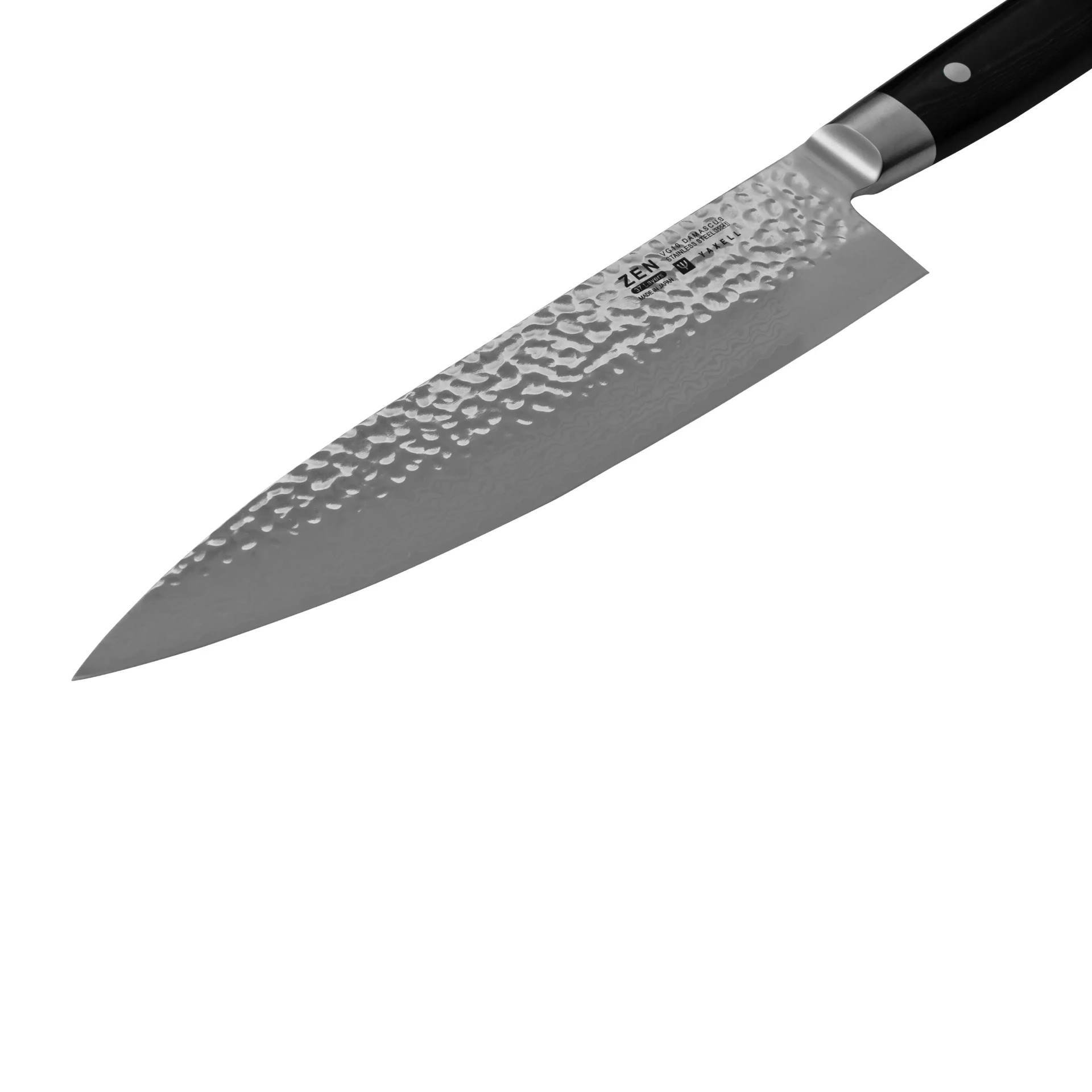 Het lemmet bestaat uit 37 lagen damaststaal en een kern van Japans VG10-staal gehard tot 61HRC. VG10 staal staat er om bekend dat het erg hard is en daardoor ook erg scherp geslepen kan worden (slijphoek 12°). Het gehamerde effect op het lemmet is een traditionele afwerking die ontstond door de hamerslagen van de smid tijdens het smeden van het lemmet. Naast dat het er fraai uit ziet, zorgen de kuiltjes ervoor dat eten minder snel aan het lemmet blijft plakken. Het damaststaal zorgt voor een mooi contrast van donkere en lichte lijnen die over de gehele lengte van het lemmet lopen. Deze combinatie van staalsoort en afwerking zorgt dat de Yaxell Zen-messen efficiënt zijn, maar er ook erg fraai uitzien.