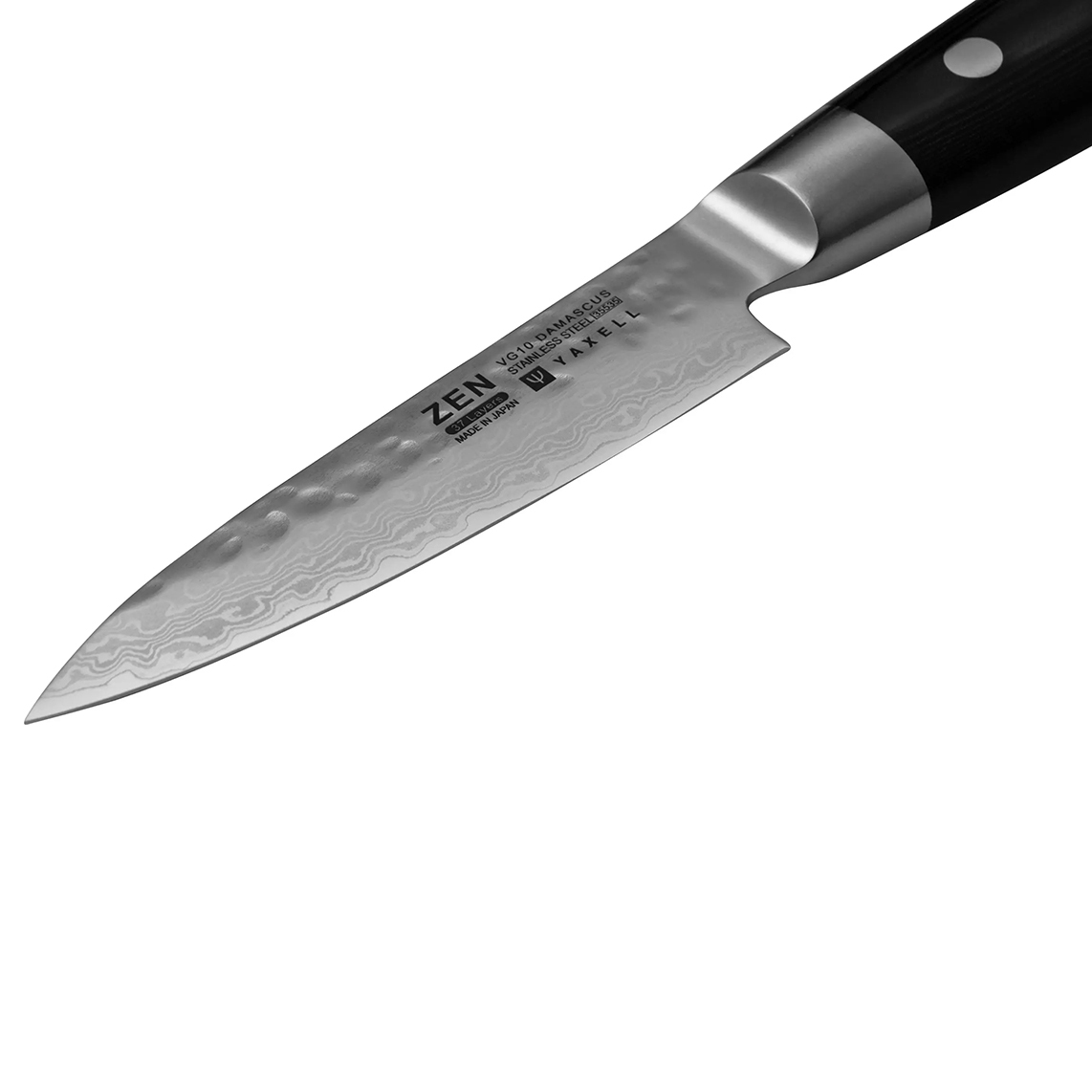 Het lemmet bestaat uit 37 lagen damaststaal en een kern van Japans VG10-staal gehard tot 61HRC. VG10 staal staat er om bekend dat het erg hard is en daardoor ook erg scherp geslepen kan worden (slijphoek 12°). Het gehamerde effect op het lemmet is een traditionele afwerking die ontstond door de hamerslagen van de smid tijdens het smeden van het lemmet. Naast dat het er fraai uit ziet, zorgen de kuiltjes ervoor dat eten minder snel aan het lemmet blijft plakken. Het damaststaal zorgt voor een mooi contrast van donkere en lichte lijnen die over de gehele lengte van het lemmet lopen. Deze combinatie van staalsoort en afwerking zorgt dat de Yaxell Zen-messen efficiënt zijn, maar er ook erg fraai uitzien.