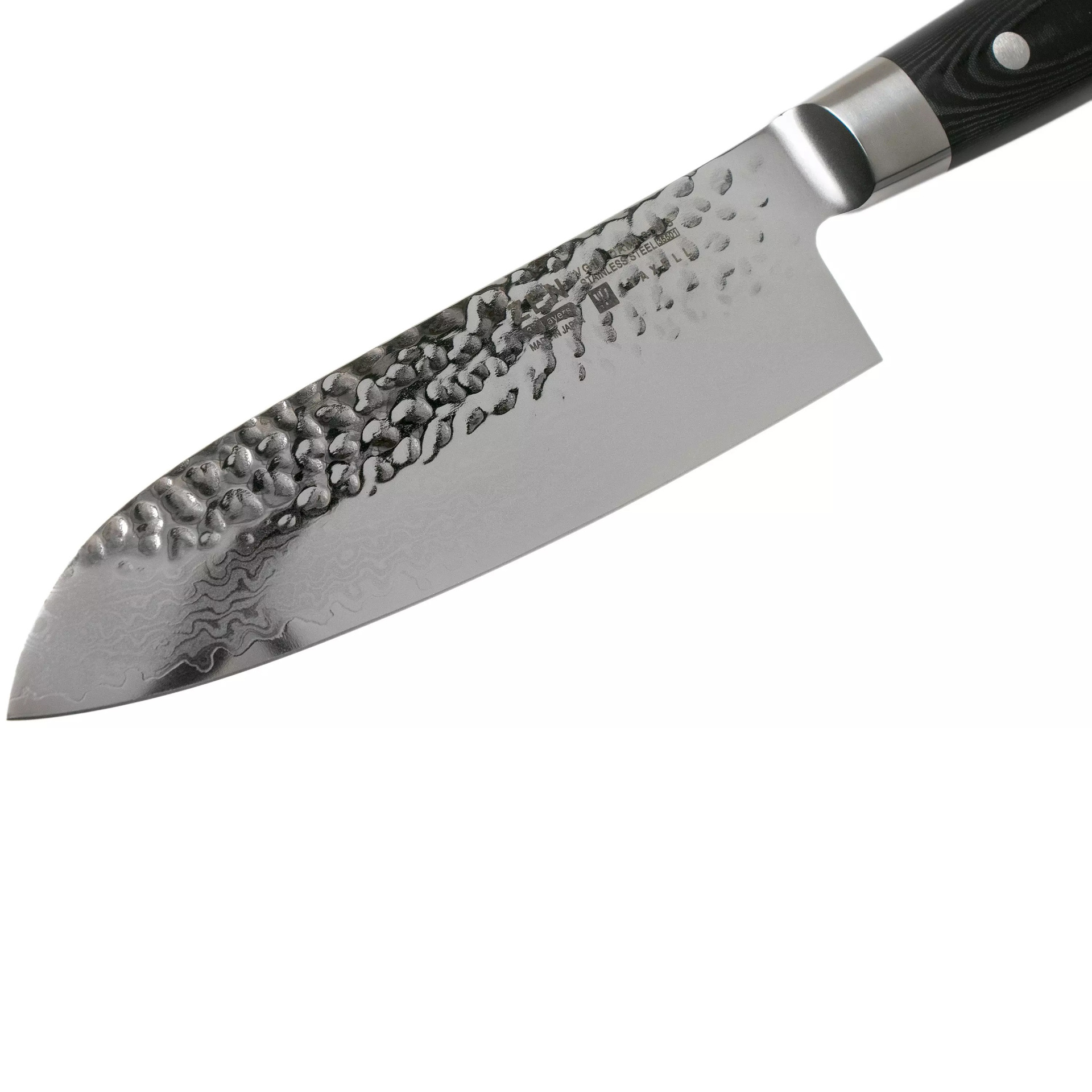 Het lemmet bestaat uit 37 lagen damaststaal en een kern van Japans VG10-staal gehard tot 61HRC. VG10 staal staat er om bekend dat het erg hard is en daardoor ook erg scherp geslepen kan worden (slijphoek 12°). Het gehamerde effect op het lemmet is een traditionele afwerking die ontstond door de hamerslagen van de smid tijdens het smeden van het lemmet. Naast dat het er fraai uit ziet, zorgen de kuiltjes ervoor dat eten minder snel aan het lemmet blijft plakken. Het damaststaal zorgt voor een mooi contrast van donkere en lichte lijnen die over de gehele lengte van het lemmet lopen. Deze combinatie van staalsoort en afwerking zorgt dat de Yaxell Zen-messen efficiënt zijn, maar er ook erg fraai uitzien.