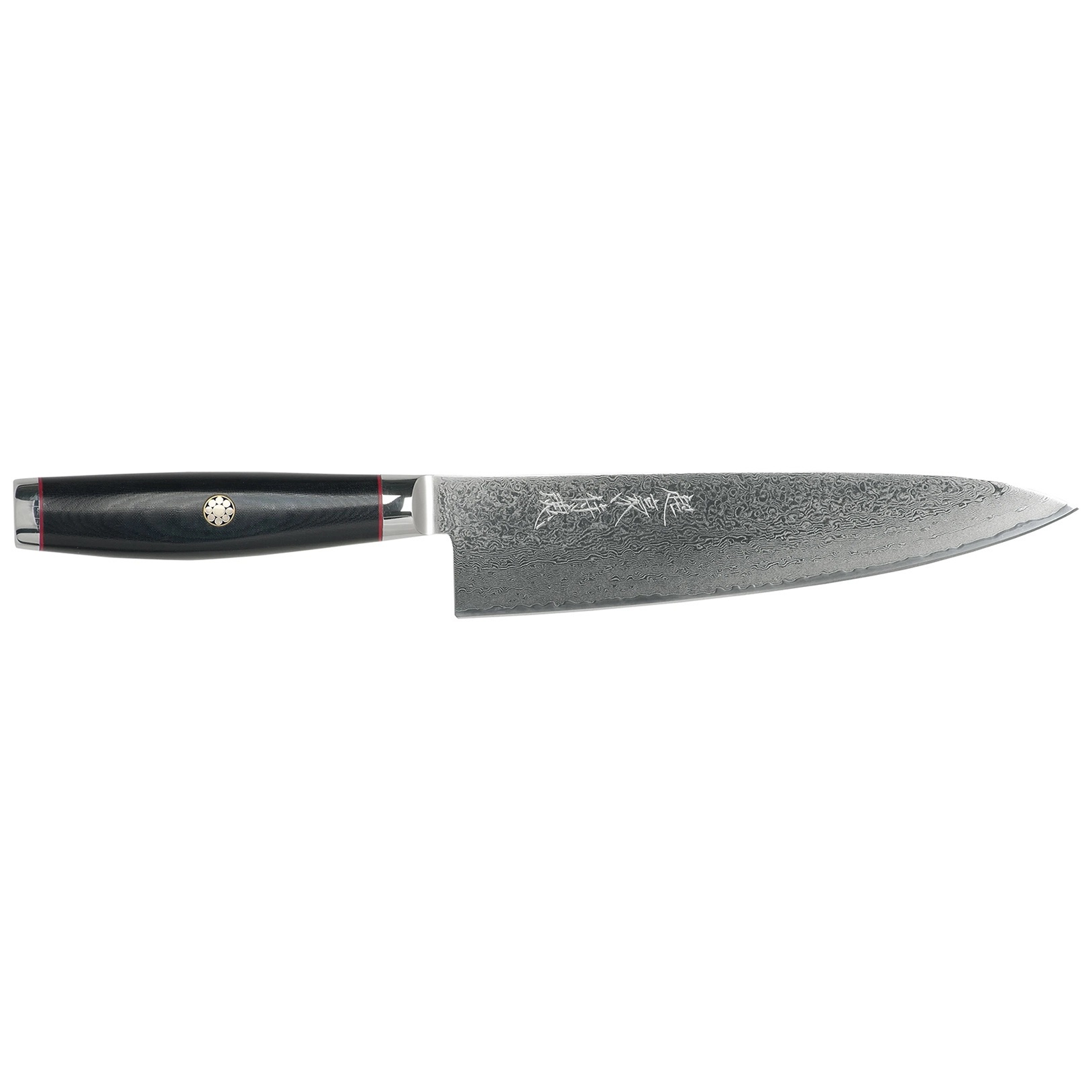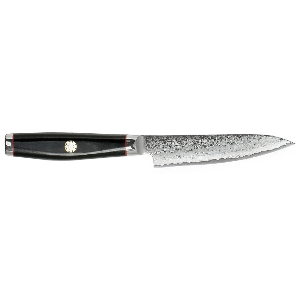 Super Gou Ypsilon heeft een SG2 Micro-Carbide poeder roestvrij stalen snijkern met een superieure hardheid van HRC63 op de Rockwell schaal. De messen uit de serie hebben een indrukwekkend 193-lagen lemmet met een prachtig Damascus patroon en met de Japanse naam zowel op het lemmet als op het greepuiteinde gegraveerd. Het elegante zwarte Micarta handvat heeft een ingelegd samurai familiewapen. Het is een uitzonderlijk mooi vervaardigd mes dat superieure snijprestaties levert.